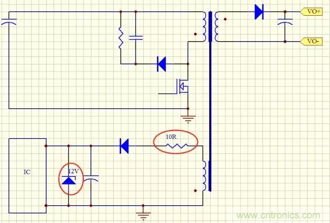 但是不要忘了,上麵分析的這個還是比較好的情況來分析的,我們試想一下,你的變壓器Vcc繞組上的電壓不可能設計的那麼準,比如在輸出空載時Vcc繞組是14V,如果主輸出功率比較大,Vcc可能上升都18V,20V甚至更高,另外Vcc電壓飄跟電源功率,跟變壓器繞製工藝也有很大關係,這些都是不好把控的,調試的需要限流電阻也不一定是10Ω,所以這個方案肯定是不行的。