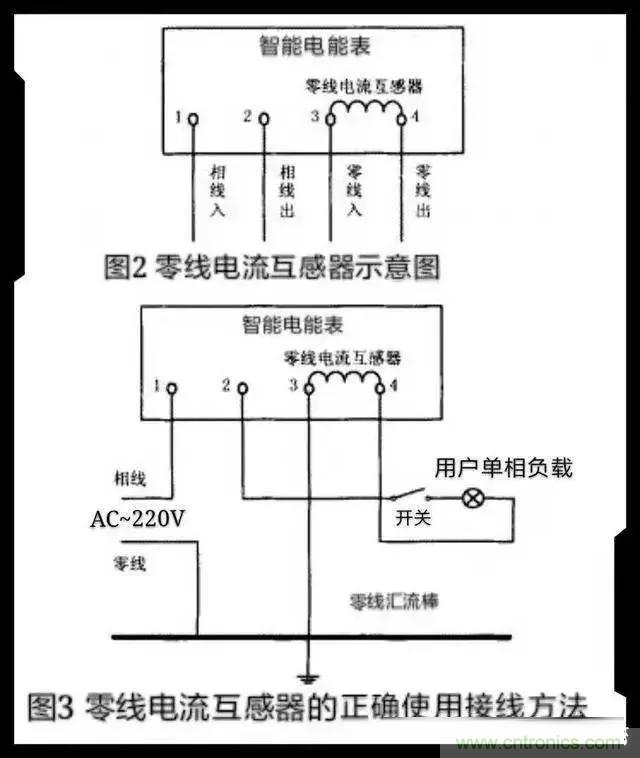 這種智能計量裝置采用微處理器和專門用於電能計量的芯片。它具有功能完善、計量精度高等等特點。而對於單相220V的用電用戶來說,現在的智能電能表在其內部結構中都已經安裝了“零線電流互感器”。為了提高智能電能表的技術防護能力,在電源進、出(chu)相(xiang)線(xian)短(duan)接(jie)的(de)情(qing)況(kuang)下(xia),它(ta)能(neng)夠(gou)檢(jian)測(ce)流(liu)過(guo)電(dian)能(neng)表(biao)的(de)零(ling)線(xian)回(hui)路(lu)中(zhong)的(de)電(dian)流(liu)。而(er)且(qie)國(guo)家(jia)電(dian)網(wang)在(zai)技(ji)術(shu)規(gui)範(fan)要(yao)求(qiu)中(zhong)明(ming)確(que)提(ti)出(chu),所(suo)有(you)的(de)智(zhi)能(neng)電(dian)能(neng)表(biao)都(dou)必(bi)須(xu)安(an)裝(zhuang)有(you)零(ling)線(xian)電(dian)流(liu)互(hu)感(gan)器(qi)測(ce)量(liang)、記錄的功能。請看下圖所示