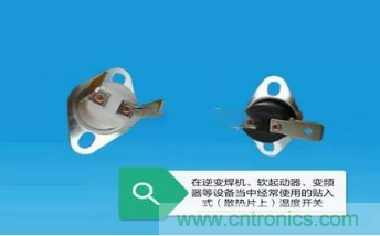 溫度開關的額定電流值(雙金屬片間流過電流值)一般有1A、2A、5A三個等級。溫度開關常見的封裝形式有塑封片狀、金屬殼長條形等,其在電炒鍋、電餅鐺、電烤箱等電熱炊具中被廣泛使用;而在軟啟動器、變頻器、逆變式焊機等工控設備中,溫度開關多被固定在大功率元件(晶閘管、IGBT)背後的鋁製散熱片上;此外溫度開關還會被植入電動機、大容量變壓器繞組內,充當超溫預警、溫度保護元件。