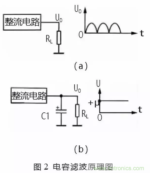 圖2(a)為整流電路的輸出電路。交流電壓經整流電路之後輸出的是單向脈動性直流電,即電路中的 UO。