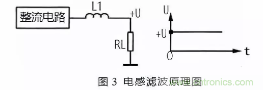 圖 3 所示是電感濾波原理圖。由於電感 L1 對直流電相當於通路,這樣整流電路輸出的直流電壓直接加到負載 RL 上。