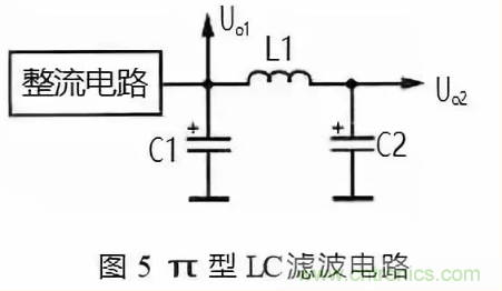 在圖 5 的電路中,整流電路輸出的單向脈動性直流電壓先經電容 C1 濾波,去掉大部分交流成分,然後再加到 L1 和 C2 濾波電路中。