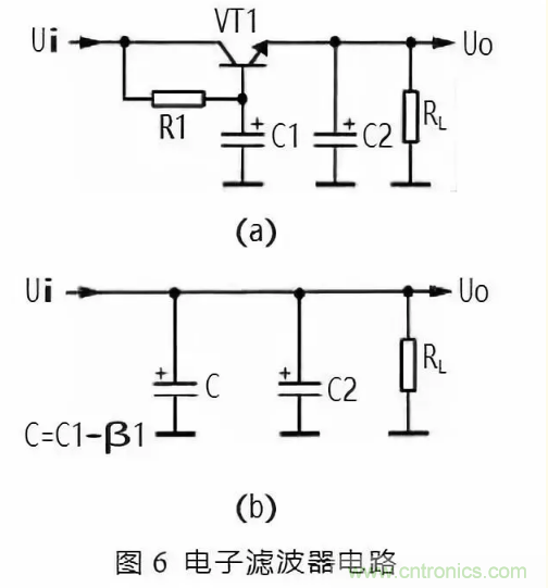 ① 電路中的 VT1、R1、C1 組成電子濾波器電路,這一電路相當於一 隻容量為 C1×β1 大小電容器,β1 為 VT1 的電流放大倍數,而晶體管的電流放大倍數比較大,所以等效電容量很大,可見電子濾波器的濾波性能是很好的。等效電路如圖 6(b)所示。圖中 C 為等效電容。