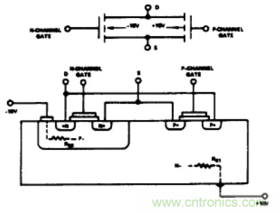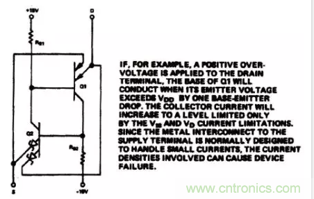 圖1是一個典型CMOS輸出開關單元的電路圖及截麵圖。從不同單元和區域之間的連接關係中,我們可以畫出一個等效二極管電路圖(圖2)。如果在S端或D端的模擬輸人電壓超過電源電壓。