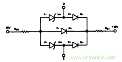 圖4舉例說明了通過在電源供電引腳串聯二極管(比如1N459)防止寄生晶體管導通的方法。如果S端或D端電壓高於電源電壓時,CR1和/或CR2反向偏置,基極驅動電路不能使晶體管導通。每個CMOS器件都應該有一對獨立的二極管對其進行保護。盡管這個方法很有效,但它不是萬無一失的。如果開關的一端連接到一個負電位(例如一個充電電容),並且另一端電壓超過VDD,則盡管有保護二極管。