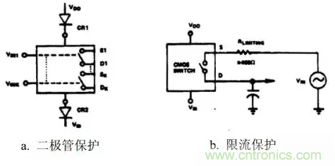過壓能引起過大的電流和金屬化問題。通常,運算放大器的輸出作為S端或D端的電壓源,因此電流不能大於運算放大器直流輸出電流的限值。然而,瞬態感應電流仍有可能破壞CMOS器件;因此,有必要進行保護。