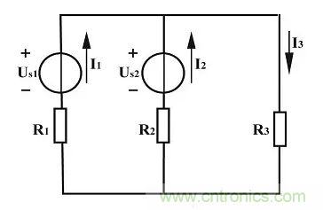 【例1】如上圖所示電路是汽車上的發電機(US1)、蓄電池(US2)和負載(R3)並聯的原理圖。已知US1=12V,US2=6V,R1=R2=1Ω,R3=5Ω,求各支路電流。