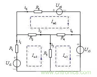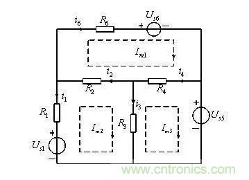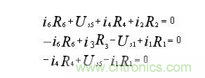 2) 若有m條支路,根據基爾霍夫電壓定律列(m-n+1)個的獨立回路電壓方程。為了計算方便,通常選網孔作為回路(網孔就是平麵電路內不再存在其他支路的回路)。對於平麵電路,獨立的基爾霍夫電壓方程數等於網孔數。