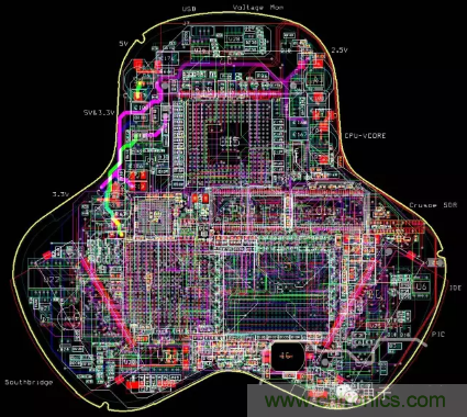 圖4 這片掌上電腦的12層電路板原型看起來很厲害,但是因為自動布線器搞砸了PCI總線的時序,根本無法運作。