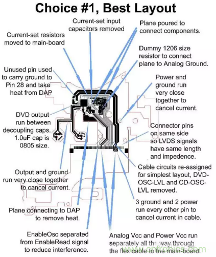 我在某家半導體公司任職時,做的是驅動PC用DVD刻錄機內雷射頭的芯片;我看了一眼某客戶設計的軟性電路板原型,就知道他們缺乏高速或散熱設計方麵的經驗,畢竟他們之前做的CD刻錄機數據速率比較低,而且用的芯片不會產生太多熱度。而我們花了大半年的時間教客戶該怎麼設計他們的PCB(圖5)。