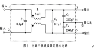 該五端器件有兩個輸入端、兩個輸出端和一個接地端,使用時外殼應接通大地。電路中包括共模扼流圈(亦稱共模電感)L、濾波電容C1~C4。Lduichuanmoganraobuqizuoyong,dandangchuxiangongmoganraoshi,youyulianggexianquandecitongfangxiangxiangtong,jingguoouhehouzongdianganliangxunsuzengda,yinciduigongmoxinhaochengxianhendadegankang,shizhibuyitongguo,guchengzuogongmoeliuquan。tadelianggexianquanfenbieraozaidisunhao、高導磁率的鐵氧體磁環上,當有電流通過時,兩個線圈上的磁場就會互相加強。L的電感量與EMI濾波器的額定電流I有關,參見表1。