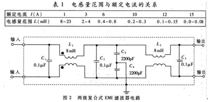 需(xu)要(yao)指(zhi)出(chu),當(dang)額(e)定(ding)電(dian)流(liu)較(jiao)大(da)時(shi),共(gong)模(mo)扼(e)流(liu)圈(quan)的(de)線(xian)徑(jing)也(ye)要(yao)相(xiang)應(ying)增(zeng)大(da),以(yi)便(bian)能(neng)承(cheng)受(shou)較(jiao)大(da)的(de)電(dian)流(liu)。此(ci)外(wai),適(shi)當(dang)增(zeng)加(jia)電(dian)感(gan)量(liang),可(ke)改(gai)善(shan)低(di)頻(pin)衰(shuai)減(jian)特(te)性(xing)。C1和C2采用薄膜電容器,容量範圍大致是0.01Μf~0.47μF,主要用來濾除串模幹擾。C3和C4跨接在輸出端,並將電容器的中點接地,能有效地抑製共模幹擾。C3和C4亦可並聯在輸入端,仍選用陶瓷電容,容量範圍是2200Pf~0.1μF。為減小漏電流,電容量不得超過0.1μF,並且電容器中點應與大地接通。C1~C4的耐壓值均為630VDC或250VAC。圖2示出一種兩級複合式EMI濾波器的內部電路,由於采用兩級(亦稱兩節)濾(lv)波(bo),因(yin)此(ci)濾(lv)除(chu)噪(zao)聲(sheng)的(de)效(xiao)果(guo)更(geng)佳(jia)。針(zhen)對(dui)某(mou)些(xie)用(yong)戶(hu)現(xian)場(chang)存(cun)在(zai)重(zhong)複(fu)頻(pin)率(lv)為(wei)幾(ji)千(qian)赫(he)茲(zi)的(de)快(kuai)速(su)瞬(shun)態(tai)群(qun)脈(mai)衝(chong)幹(gan)擾(rao)的(de)問(wen)題(ti),國(guo)內(nei)外(wai)還(hai)開(kai)發(fa)出(chu)群(qun)脈(mai)衝(chong)濾(lv)波(bo)器(qi)(亦稱群脈衝對抗器),能對上述幹擾起到抑製作用。