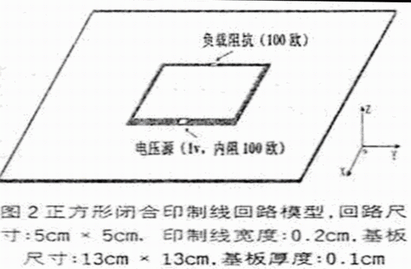 這是一種帶有接地平麵的正方形的閉合印製線環路,在回路的兩端分別接有電壓源和阻抗相等的源內阻、負載,當電壓信號的頻率較高時,這種結構與方環形天線是非常相似的,成為一種嚴重的輻射源。