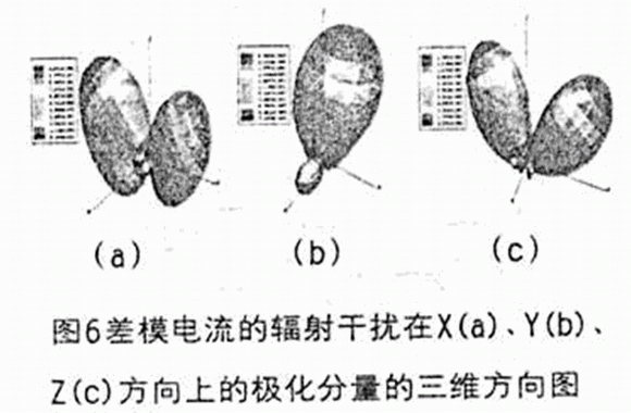 閉合印製線回路上流過的差模電流產生的輻射幹擾在各個極化方向上的分布是不同的。圖6是矩形印製線回路的源和終端所在的邊為3(回路麵積為25)時頻率為1.5GHz差模電流的輻射幹擾在X、Y、Z方向上的極化分量的三維方向圖,從圖中可以看到,X和Z方向上的極化分量主要集中於印製板正麵的X軸的兩側,而Y方向上的極化分量主要集中於印製板的正上方區域,並且沿Y方向的極化分量最大,分別為X、Y方向極化分量的兩倍左右,對於源和終端所在邊為2cm、4cm和5cm時的閉合回路也是如此。