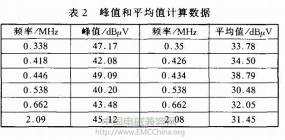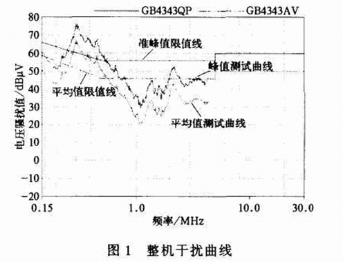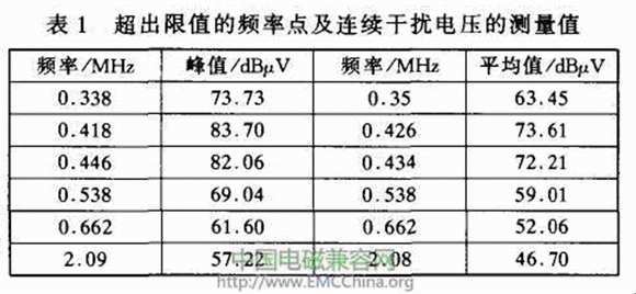 圖1是某一台空調產品連續幹擾電壓的測試曲線(執行GtM343.1—2003《家用和類似用途電動、電熱器具,電動工具以及類似電器無線電幹擾特性測量方法和允許值》l11)。表1是超出限值的一些頻率點及連續幹擾電壓的峰值和平均值的測量值。