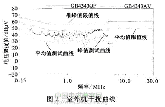 從圖1和表1中可以看出,連續幹擾電壓主要是在0.15~2 MHz頻率範圍內超標。空調產生的電磁兼容問題,一半以上發生在控製部分。但是在這個頻率範圍,也很有可能存在馬達引起的幹擾。