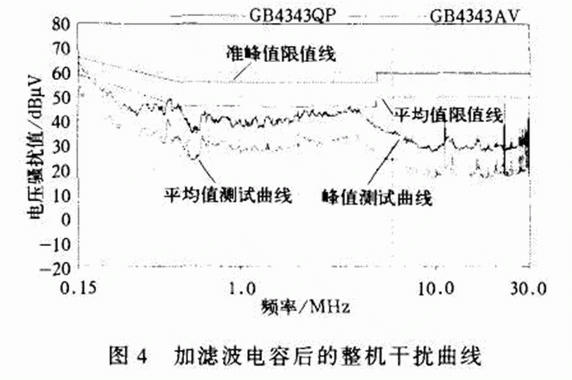 由圖4和表2可ke以yi看kan出chu,在zai加jia了le濾lv波bo電dian容rong後hou,超chao出chu限xian值zhi線xian的de幹gan擾rao均jun被bei濾lv掉diao。在zai實shi際ji應ying用yong中zhong,單dan一yi的de電dian容rong器qi不bu可ke能neng在zai從cong低di頻pin段duan到dao高gao頻pin段duan都dou能neng令ling人ren滿man意yi。這zhe種zhong情qing況kuang下xia可ke以yi將jiang兩liang個ge不bu同tong類lei型xing的de電dian容rong器qi並bing聯lian使shi用yong,會hui取qu得de良liang好hao的de效xiao果guo。