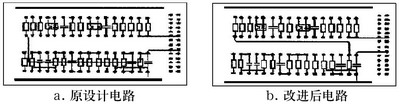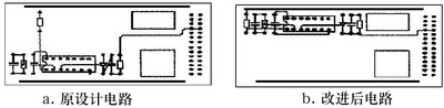 圖2取自某雷達發射機磁場控製保護PCB的部分電路。重新布局元器件後改進的PCB電路(如圖2b)較改進前的PCB電路(如圖2a)在抗幹擾性能上有很大的改善。