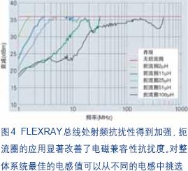 物理層應用指南明確指出了對FlexRay網絡數據線扼流圈的總體要求,比如引線電阻(<1W)、電感(>50mH)以及雜散電感(<1mH)。對電磁輻射和電磁幹擾的測定與CAN總線一樣。不過,由於10Mbit/s的更高傳輸率,需要更加仔細地檢查信號完整性。圖4所示為對具有各種電感的扼流圈與不使用扼流圈的測試板進行DPI測ce定ding的de相xiang應ying評ping估gu結jie果guo。圖tu五wu所suo示shi為wei使shi用yong另ling一yi塊kuai測ce試shi板ban進jin行xing電dian磁ci幹gan擾rao測ce量liang的de結jie果guo,同tong樣yang是shi針zhen對dui具ju有you不bu同tong電dian感gan的de扼e流liu圈quan。很hen明ming顯xian可ke以yi發fa現xian,數shu據ju線xian扼e流liu圈quan的de使shi用yong改gai善shan了le電dian磁ci兼jian容rong性xing並bing減jian少shao了le幹gan擾rao輻fu射she。當dang電dian感gan更geng高gao時shi,作zuo用yong就jiu更geng大da。不bu過guo,更geng高gao的de電dian感gan值zhi會hui對dui信xin號hao完wan整zheng性xing產chan生sheng一yi定ding的de負fu麵mian影ying響xiang。[page]