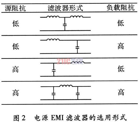 Cy用於抑製較高頻率的共模幹擾信號,取值範圍一般為2200~6800 pF。常選用自諧振頻率較高的陶瓷電容。由於接地,共模電容Cy上會產生漏電流Ii-d。因為漏電流會對人體安全造成傷害,所以漏電流應盡量小,通常<1.0 mA。共模電容取值與漏電流大小有關,所以不宜過大,取值範圍一般為2200~4700 pF。R為Cx的泄放電阻。電源濾波器的性能很大程度上取決於其端阻抗,根據信號傳輸理論,濾波器輸入端與電源端的端接、濾波器輸出端與負載端的端接應遵循阻抗極大不匹配原則。因此,濾波器設計時應遵循:(1)源內阻是高阻(低阻)的,濾波器輸入阻抗就應該是低阻(高阻);(2)負載是高阻(低阻)的,則濾波器輸出阻抗就應該是低阻(高阻)。對EMI信號來說,電感是高阻,電容是低阻,則有圖1中的4種濾波器選用類型。