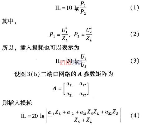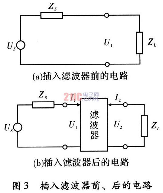插入損耗是評價濾波器性能的主要指標,它是頻率的函數。插入損耗的定義為,沒有濾波器接入時,從噪聲源傳輸到負載的功率P1和接入濾波器後噪聲源傳輸到負載的功率P2之比,用dB表示。插入損耗越大,說明濾波器抑製幹擾的能力越強。濾波器接入前後的電路圖,如圖3(a)和圖3(b)所示。濾波器的插入損耗由式(1)表示。