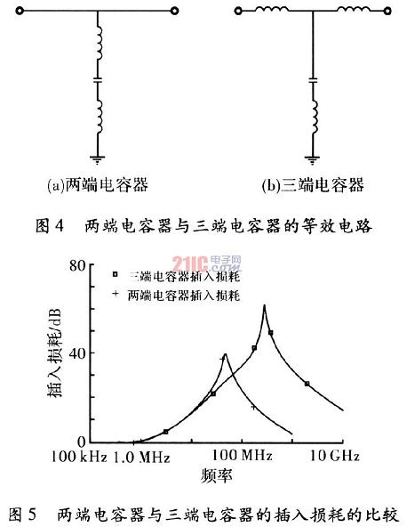 通常采用旁路電容抑製高頻噪聲。實際的電容器不僅具有電容C,還有等效串聯電阻ESR和等效串聯電感ESL。youyujishengdiangandeyingxiang,duiyuyigeshijidedianrongcunzaizhezixiezhenpinlv。zaizhegepinlvyishangshi,dianrongchengganxing。yuanjiandejishengcanshuyehuijidadiyingxianglvboqidegaopintexing。dianrongdejishengdianganshizhuyaodejishengcanshu,erduiyudianganlaishuo,jishengdianrongshizhuyaodejishengcanshu。dianrongqiyongzuopangludianrongshi,rutu4(a)所示,兩端電容器一端接地,另一端與信號線連接。三端電容器一端接地,其餘兩端與電容器的一個電極相連並串聯到信號線上,如圖4(b)suoshi。yibandeliangduandianrongqiyouyuyuqidianlulianjiedeyinxiandianganhuodianjisuochanshengdedengxiaochuanliandianganjiaoda,suoyizixiezhendianjiaodi,pangtongxiaoyingyesuizhijiangdi。caiyongsanduandianrongqikeyouxiaogaishanciquexian。yuanyinzaiyusanduandianrongqizhongliurudidedianliuyuxinhaoxianzhongdianliufangxiangzhengjiao,suoyiqijishengdianganbiliangduandianrongjiangdiyue50%,並且其中70%以上的寄生電感轉移到信號線上。因此提高了三端電容器的自諧振頻率,也可以將它作為T形xing濾lv波bo器qi使shi用yong,更geng好hao地di抑yi製zhi高gao頻pin噪zao聲sheng。三san端duan電dian容rong器qi的de地di線xian電dian感gan起qi著zhe不bu良liang作zuo用yong,作zuo為wei旁pang路lu電dian容rong抑yi製zhi高gao頻pin噪zao聲sheng時shi,宜yi采cai用yong無wu引yin線xian的de片pian式shi陶tao瓷ci電dian容rong器qi。圖tu5為兩端電容器與三端電容器插入損耗的比較。