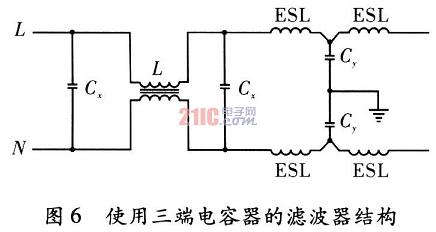 線路旁通電容Cy是用來消除高頻噪聲的組件,基於對今後開關操作頻率的高頻化考慮,宜選用能消除頻率高達1000MHz噪聲的電容器。而一般的兩端結構的旁通電容器僅能消除30MHz左右的噪聲。由以上介紹可知,相對兩端電容器來說,三端電容器能更好地抑製高頻噪聲。以EMI濾波器的一般結構為基礎,用三端電容器替代其中的兩端旁通電容Cy,電路圖,如圖6所示。其中ESL為三端電容器信號線上的等效串聯電感。