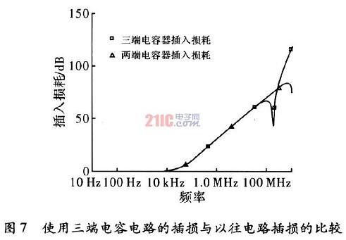 取差模電容Cx為0.1μF,共模電容Cy為2200pF,共模電感L取8mH。三端電容的等效串聯電感ESL取0.36nH。在50 Ω/50 ΩQ係統中分別對一般結構的EMI濾波器和使用了三端電容器的EMI濾波器的插入損耗進行PSpice仿真。如圖7所示,EMI濾波器在使用三端電容時,諧振點之後的插損效果明顯好於在濾波器中使用兩端電容的插損。提高了濾波器在高頻段的性能。