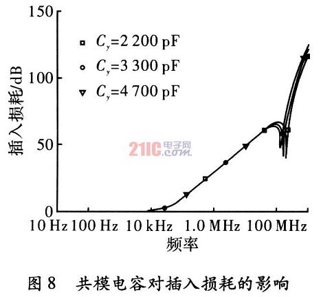 在使用三端電容的濾波器電路中,輸入阻抗和輸出阻抗都取50時,分別取共模電容Cy為4700pF,3300pF和2200pF,其他參數不變,觀察共模電容Cy變化時對插入損耗的影響。通過圖8的仿真結果看出,隨著共模電容的增大,在高頻段插入損耗有所提高,並且濾波器諧振點降低;而在低頻段基本沒有變化。因此可以通過選擇較大的共模電容來提高濾波器高頻段的插入損耗。由於共模電容需要接地,有漏電流,Iid的存在,對人身安全存在威脅。而共模電容越大,漏電流越大,所以選擇共模電容時需要在漏電流滿足安全條件的情況下取值。