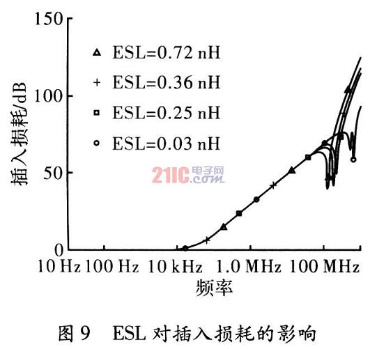 考察三端電容器與信號線串聯的等效串聯電感ESL對插入損耗的影響。取共模電容Cy為3 300 pF,取ESL分別為0.03 nH,0.36 nH和0.72 nH,其他參數值不變。從圖9的仿真結果可以看出,隨著ESL降低,諧振點提高,諧振點之後的插入損耗下降。