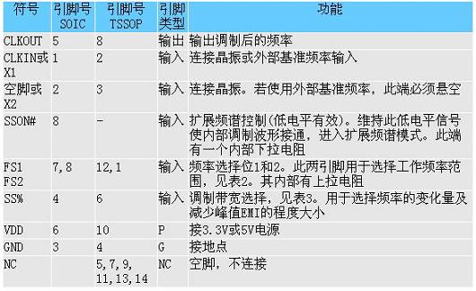 關鍵技術規範有:工作電壓:VDD=3.3V±5%或VDD=5V±10%;頻率範圍:28MHz≤Fin≤75MHz;晶振基準頻率範圍:28MHz≤Fin≤40MHz;周期偏差:300ps(最大);可選擴展比率:-1.25%或-3.75%;輸出占空比:40/60%(最壞情況);輸出上升及下降時間:5ns(最大)。