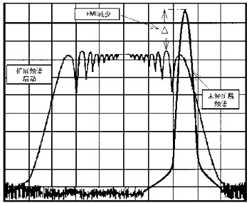 使用擴展頻譜定時信號發生的好處如圖3所示。它表示出了一個時鍾諧波EMI的分布。將典型時鍾的EMI與Cypress擴展頻譜頻率定時信號發生的EMI進行比較。請注意典型時鍾中的尖峰信號,該尖峰信號使係統的準峰值EMI測試衰退。經過頻譜擴展後,峰值能量將極大減少(至少8dB),因為能量通過一個更寬的帶寬散發了。