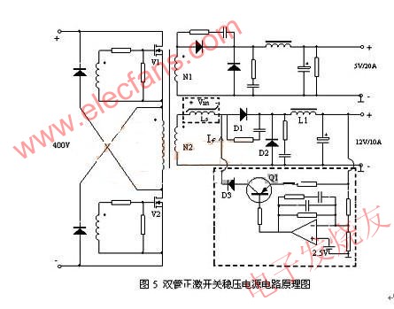 磁(ci)放(fang)大(da)器(qi)穩(wen)壓(ya)是(shi)利(li)用(yong)可(ke)飽(bao)和(he)電(dian)感(gan)導(dao)通(tong)延(yan)時(shi)的(de)物(wu)理(li)特(te)性(xing)來(lai)控(kong)製(zhi)開(kai)關(guan)電(dian)源(yuan)的(de)占(zhan)空(kong)比(bi)和(he)輸(shu)出(chu)功(gong)率(lv),穩(wen)定(ding)電(dian)源(yuan)輸(shu)出(chu)電(dian)壓(ya)的(de)一(yi)種(zhong)方(fang)法(fa)。在(zai)可(ke)飽(bao)和(he)電(dian)感(gan)上(shang)加(jia)上(shang)適(shi)當(dang)的(de)采(cai)樣(yang)和(he)控(kong)製(zhi)元(yuan)件(jian),調(tiao)節(jie)其(qi)導(dao)通(tong)延(yan)時(shi)的(de)時(shi)間(jian),就(jiu)可(ke)以(yi)構(gou)成(cheng)最(zui)常(chang)見(jian)的(de)磁(ci)放(fang)大(da)器(qi)穩(wen)壓(ya)電(dian)路(lu)。圖(tu)5是一個輸入為110Vac~220Vac/50HZ,輸出為5Vdc/20A,12Vdc/10A的雙管正激開關穩壓電源,其中5V是主控回路。其輔路12V輸shu出chu電dian流liu較jiao大da,對dui穩wen壓ya精jing度du和he負fu載zai穩wen定ding度du都dou有you較jiao高gao要yao求qiu,采cai用yong普pu通tong的de方fang法fa穩wen壓ya效xiao果guo都dou不bu是shi很hen理li想xiang,如ru果guo采cai用yong磁ci放fang大da器qi穩wen壓ya技ji術shu就jiu可ke圓yuan滿man解jie決jue這zhe一yi問wen題ti,使shi穩wen壓ya電dian路lu的de結jie構gou簡jian單dan,耗hao散san功gong率lv小xiao,並bing可ke達da到dao毫hao伏fu級ji的de穩wen壓ya精jing度du。
