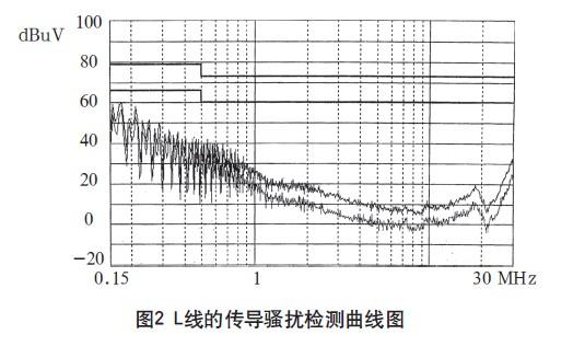 在3m法電波暗室對試驗樣機進行測試,其L、N線的傳導騷擾檢測曲線如圖2、3所示,輻射騷擾的垂直極化掃描曲線如圖4、5所示。