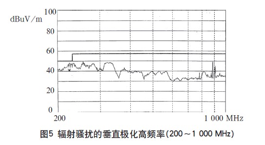 本開關電源一次通過了傳導騷擾的測試,測試波形如圖2、3所示。輻射騷擾高頻段230~1000MHz也測試合格,如圖5所示。隻是在30~200MHz頻段範圍內的垂直極化指標超標,最大超標20dB,如圖4所示。