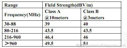 EMI測試是在特定的電波暗室中進行的,測量由產品中輻射出來的電磁波強度,與FCC等規範相比較,不得超過規定的最大能量。FCC規範中將產品按用途分為CLASS A 、CLASS B 兩大類,A 類為用於商務或工業用途的產品,B 類為用於家庭用途的產品, FCC 對 B 類產品法規要求更嚴格。下表顯示的是FCC 規範的CLASS A和CLASS B標準: