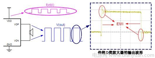 傳統D類放大器開關輸出的拓撲結構是一個很好的EMI發射源:如調製的開關信號,開關信號的邊沿變化,電源線上變化的電流信號等都會產生大量的EMI,如下圖所示。