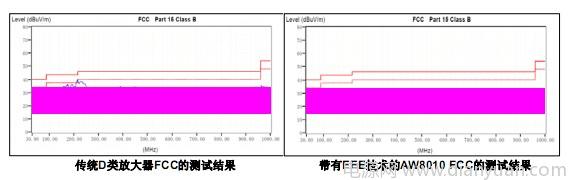 下麵是傳統D類放大器和帶有EEE技術的AW8010的EMI測試結果,測試使用60cm(24inch)的輸出線。上麵的紅色實線是FCC CLASS B的標準線,紅色虛線是-6dB的裕量線,藍色的線是實際測試曲線,粉色的線是測試環境的EMI背景噪音。