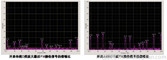 下圖是傳統D類放大器和帶EEE技術的AW8010對FM接收信號的信噪比影響。傳統D類放大器對FM的影響很嚴重,信號變差甚至丟台,而帶EEE技術的AW8010對FM影響很小,降低了係統工程師的調試難度。