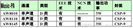 高效率、低功耗使得D類放大器的應用越來越廣泛,D類放大器EMI也越來越受到關注。采用艾為帶有EEE技術的AW8010、AW8110、AW8145,極大地降低了EMI的輻射,簡化了設計。其中音樂功放AW8110、AW8145同時還采用了獨特的、擁有專利保護的無破音(NCN:Non-Crack-Noise)技術,提高音質的同時有效地保護揚聲器,是音樂手機等便攜式設備的理想選擇。
