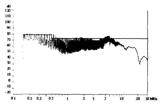 圖1為所測的15kW開關電源的傳導騷擾值,由圖中可以看出在0、15~15MHz大範圍超差。這是因為開關電源所產生的幹擾噪聲所為。開關電源所產生的幹擾噪聲分為差模噪聲和共模噪聲。