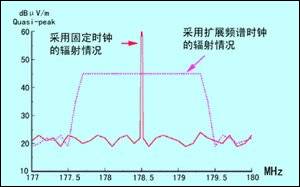 所謂的“擴展頻譜時鍾”shiyixiangnenggoujianxiaofusheceliangzhidexinjishu,danzhebingfeizhenzhengjianxiaoleshunshifashegonglv,yinci,duiyixiekuaisufanyingshebeirengkenengchanshengtongyangdeganrao。zhezhongjishuduishizhongpinlvjinxing1% ~ 2% 的調製,從而擴散諧波分量,這樣在CISPR16或FCC發射測試中的峰值較低。所測的發射減小量取決於帶寬和測試接收機的積分時間常數,因此這有一點投機之嫌,但該項技術已被FCC所接受,並在美國和歐洲廣泛應用。調製度要控製在音頻範圍內,這樣才不會使時鍾信號失真,圖2是一時鍾諧波發射改善的例子。擴展頻譜時鍾不能應用於要求嚴格的時間通信網絡中,比如以太網、光纖、FDD、ATM、SONET和ADSL。