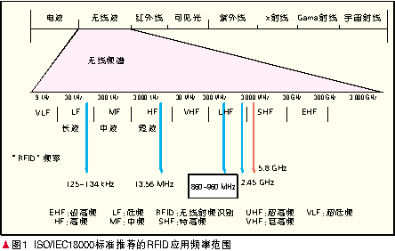 圖1顯示了ISO/IEC18000標準推薦的RFID應用頻率範圍,從圖上可以看出RFID係統分為低頻(LF)125~134 kHz、高頻(HF)13.56 MHz、超高頻(UHF)860~960 MHz與2.4 GHz和微波頻段(MW)5.8 GHz。