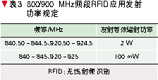 信息產業部於2007年4月23日發布了信部無[2007]205號文件《關於發布800/900 MHz頻段射頻識別(RFID)技術應用試行規定的通知》,規定800/900 MHz頻段RFID技術的具體使用頻率為840~845 MHz和920~925 MHz.表3給出了發射功率的規定。
