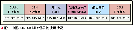 圖2顯示了中 國在860~960 MHz頻段的頻率使用現狀,920~925 MHz的RFID頻段實際上是立體聲廣播點對點傳輸業務頻段分出5 MHz與RFID共用,與GSM上/下行頻段隻有5 MHz的頻率間隔,與無中心對講機係統隻有3 MHz的頻率間隔。