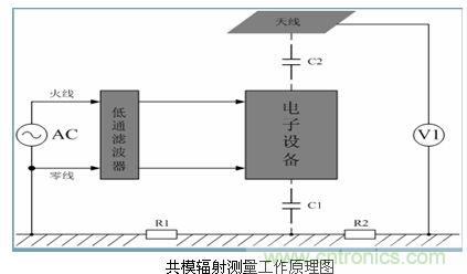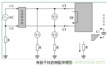 如圖所示,其中CI為共模幹擾、DI為差模幹擾、V1 = CI DI 、V2 = CI + DI 、V3 = DI ,R1、R2、R3、R4為接地電阻,C1為分布電容。