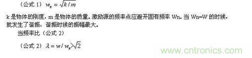 頻率可分為固有頻率Wn和激勵頻率W,固有頻率源於產品的結構特征,由質量、質量分布、質心位置、剛度等多個因素和多個因素間的相互作用所確定。固有頻率計算公式為(公式1)k是物體的剛度,m是物體的質量。激勵源的頻率點應避開固有頻率Wn。當Wn=W的時候,就發生了諧振,諧振時候的振幅最大。
