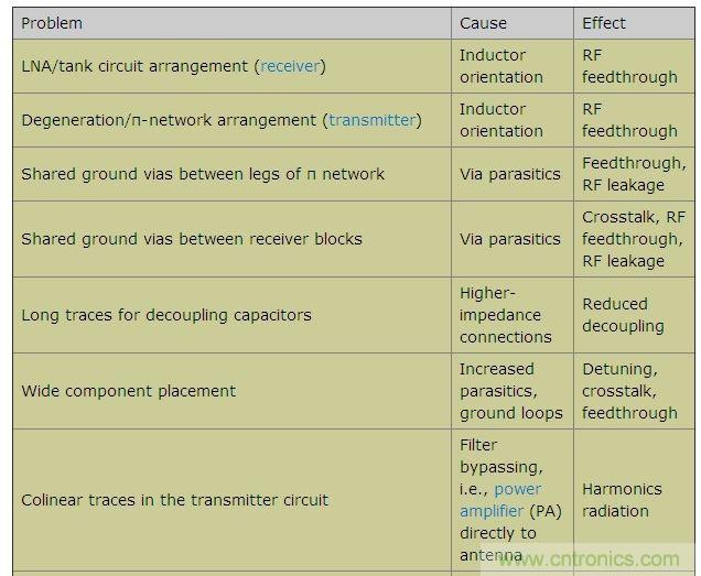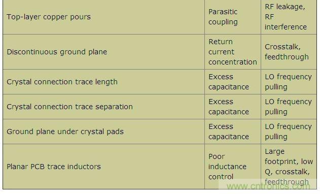 本文羅列了各種不同的設計疏忽,探討了每種失誤導致電路故障的原因,並給出了如何避免這些設計缺陷的建議。本文以FR-4電介質、厚度0.0625in的雙層PCB為例,電路板底層接地。工作頻率介於315MHz到915MHz之間的不同頻段,Tx和Rx功率介於-120dBm至+13dBm之間。表1列出了一些可能出現的PCB布局問題、原因及其影響。