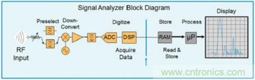 在對係統幹擾進行特征分析時,係統工程師通常依賴信號分析儀來完成長時間的連續錄存,如圖1所示。長時間錄存的主要局限是,測試設備中板子的內存容量不夠大。目標信號首先進入分析儀的RF輸入,隨後被處理,產生圖1右(you)側(ce)所(suo)顯(xian)示(shi)的(de)波(bo)形(xing)。假(jia)設(she)係(xi)統(tong)使(shi)用(yong)了(le)一(yi)個(ge)固(gu)定(ding)本(ben)機(ji)振(zhen)蕩(dang)器(qi),該(gai)儀(yi)器(qi)捕(bu)獲(huo)帶(dai)寬(kuan)內(nei)的(de)所(suo)有(you)目(mu)標(biao)信(xin)號(hao)在(zai)到(dao)達(da)藍(lan)色(se)豎(shu)線(xian)之(zhi)前(qian),都(dou)會(hui)經(jing)過(guo)實(shi)時(shi)處(chu)理(li)。一(yi)旦(dan)采(cai)樣(yang)信(xin)號(hao)進(jin)入(ru)緩(huan)存(cun)或(huo)RAM中,該儀器便不再關注新進入的數字樣本。相反,它必須處理先前錄存的采樣數據。