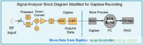 在圖2的示例中,信號分析儀已被修改為無間斷錄存。圖2中的信號分析儀與圖1中zhong的de一yi樣yang,但dan它ta包bao含han一yi條tiao高gao速su數shu據ju鏈lian路lu或huo總zong線xian,使shi工gong程cheng師shi可ke以yi將jiang采cai集ji到dao的de數shu據ju從cong內nei存cun中zhong移yi出chu去qu。它ta通tong過guo旁pang路lu處chu理li和he顯xian示shi更geng新xin,同tong時shi將jiang采cai集ji到dao的de數shu據ju直zhi接jie寫xie入ru采cai用yong環huan形xingRAM緩存的最終存儲介質,來實現數據的無間斷高帶寬錄存。工程師可以在環形RAM緩存中同時寫入和讀取數據。若在大帶寬下錄存較長時間的數據,則需獨立磁盤冗餘陣列(RAID)存儲係統。
